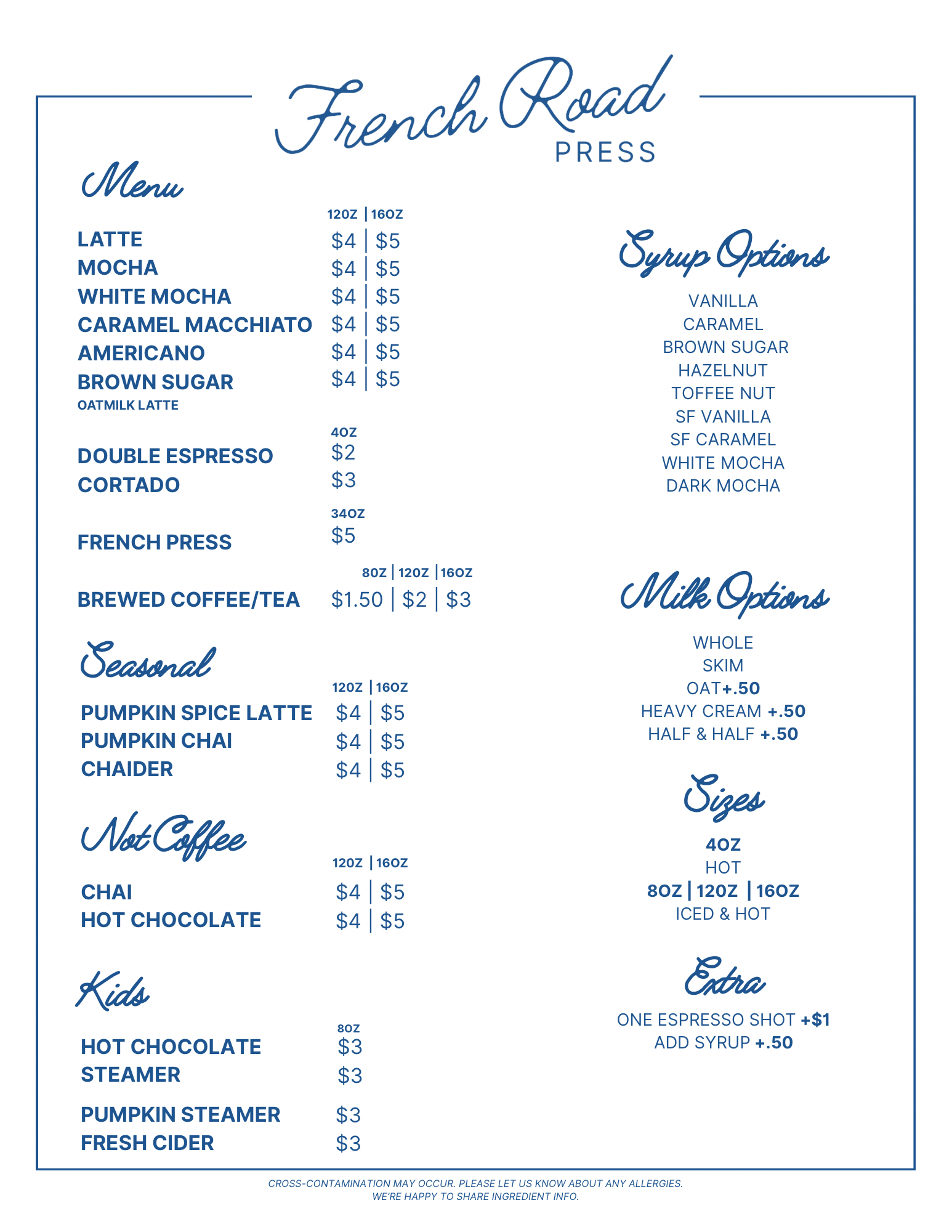 With a cozy ambiance and a friendly staff, French Road Press is your new go-to spot for coffee, treats, and community connection. We can’t wait to serve you!